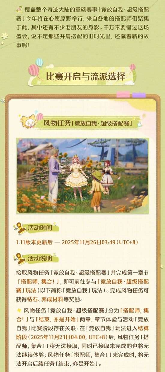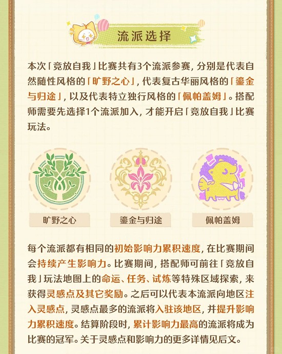 覆盖整个奇迹大陆的重磅赛事「竞放自我·超级搭配赛」今年将在心愿原野举行!来自各地的搭配师们齐聚于此,形成了三个流派:
