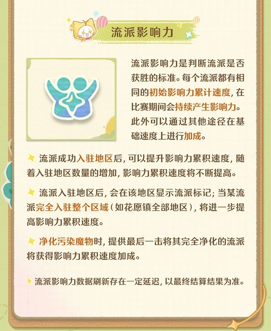 搭配师到达某一地区时,可向该地区注入灵感点。地区每周期会计算本周期内3个流派注入的灵感点数,排名第一的流派,将在下一周期成功入驻该地区,并提升相应的影响力累积速度。