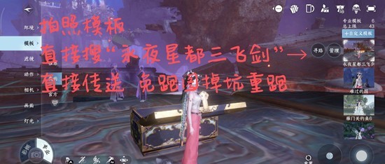 我保存了拍照自定义模板,点击“拍照-模板-搜索-永夜星都三飞剑-寻路”,就可以直接传送到那里了