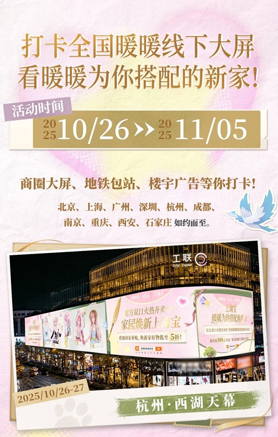 无限暖暖 × 天猫 × 88VIP联动今日已正式开启!这个双11,暖暖作为天猫「双11特邀搭配师」,即将带来满满的暖心福利,与一场温暖又梦幻的家居焕新之旅~10月26日~11月5日,暖暖将在多地线下大屏与大家见面!一起来和小编看看吧~
