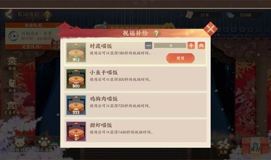 这个祝福是用来给猫猫回饱食度的,会发现猫猫饱食度一直都在掉,但是明明自己没有让他们干活,这个饱食度其实不干活也是在掉的,兑换祝福可以让没有干活的猫猫缓慢恢复饱食度,在*队列里的猫猫是吃不到祝福加成的!已经没有饭了让猫猫全都饿鼠的老师可以去*市场买猫饭,没有货币的老师可以去*喵爪连珠获得启动资金