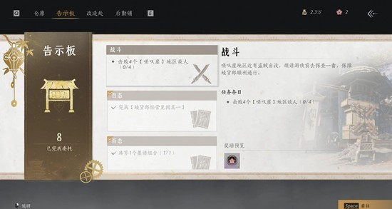 三阶段告示板任务新增战斗类任务,如嗟叹崖击败4个敌人,找到该区域附近的营地击败即可完成,打马猴、野猪之类的野怪不算,为附近营地位置