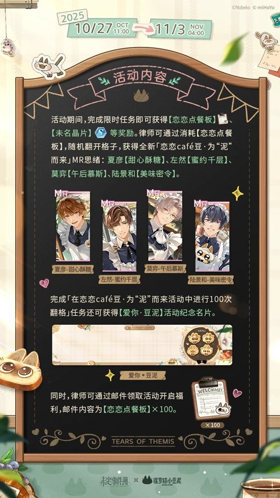 活动期间,完成限时任务即可获得【恋恋点餐板】、【未名晶片】等奖励。律师可通过消耗【恋恋点餐板】,随机翻开格子,获得全新「恋恋café豆·为“泥”而来」MR思绪:夏彦【甜心酥糖】、左然【蜜约千层】、莫弈【午后慕斯】、陆景和【美味密令】。完成「在恋恋café豆·为“泥”而来活动中进行100次翻格」任务还可获得【爱你·豆泥】活动纪念名片。同时,律师可通过邮件领取活动开启福利,邮件内容为【恋恋点餐板】×100