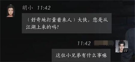 当对话开启后,玩家的第一句回应应选择“这位小兄弟有什么事嘛”,以此作为对话的切入点。这句话语气平和,带有江湖人常见的搭讪意味,能自然引出胡小的下一句陈述,确保对话顺利进入下一环节。此句为固定选项,不可跳过或替换。