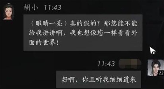 当胡小提出要分享一段故事时,玩家应回应“好啊,你且听我细细道来”。此句带有浓厚的江湖叙事色彩,符合燕云十六声整体的语言风格。选择该句后,胡小将进入下一阶段的叙述,可能涉及隐藏任务或背景线索,是对话推进的重要环节。