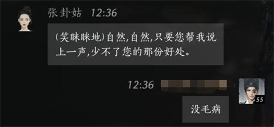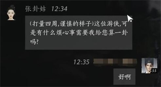 玩家在对话中需要依次选择“好啊。”“那你得给我点佣金。”“没毛病。”这三句回应。每一句都对应张卦姑的上一句提问或陈述,形成完整的逻辑衔接。按照此顺序进行选择,即可顺利完成与张卦姑的全部聊天内容。