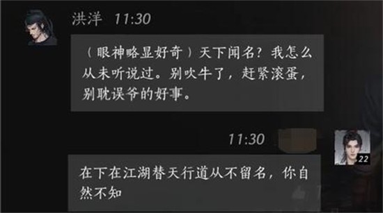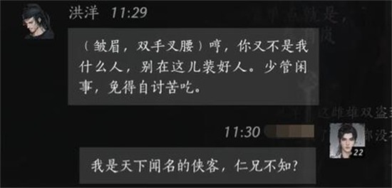 紧接着,为了增强自身说服力,玩家可以接上:“我是天下闻名的侠客,仁兄不知?”这一句设定出自燕云十六声的角色扮演机制,通过抬高身份来赢得NPC的信任。虽然洪洋并未立即回应认可,但语气已有所缓和。