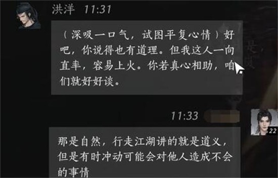 接下来的一句尤为关键:“你只需要平负自己的心情,江湖上必然有你洪大侠的威名。”此处使用“洪大侠”称呼对方,是对NPC尊严的肯定。这种正向激励在燕云十六声的对话系统中具有特殊作用,往往能直接促成任务进展。