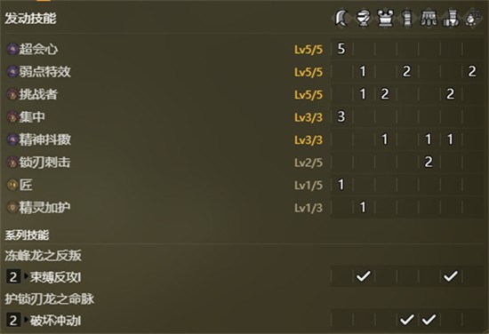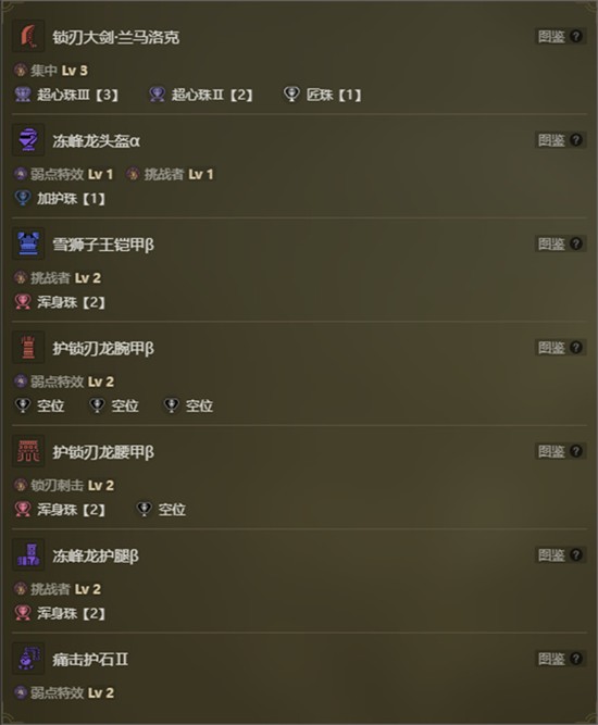 腰部装备为护锁刃龙腰甲β,配备两个一级孔和一个三级孔,适合插入高阶超心珠以进一步堆高会心率。脚部则选用冻峰龙护腿β,提供一级与二级孔各一个,同样可插入浑身珠II,强化暴击时的伤害输出。整体防具搭配下,能够稳定达成挑战者5级与满会心率的技能目标。