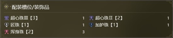 整套装备的珠子布局以超心珠和浑身珠为核心。武器部位插入超心珠III、超心珠II和匠珠,确保会心率接近100%。头部插加护珠I提升生存能力,胸部、腰部和脚部均配备浑身珠II,三颗共6级,激活浑身技能后大幅提升会心伤害。臂部一级孔可根据个人习惯选择加护、耐绝或其他辅助类珠子,提升战斗稳定性。
