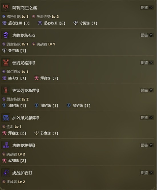 本套电锯流盾斧配装以阿剌克涅之镰为武器核心,该武器具备优秀的物理面板与元素属性加成,契合盾斧剑形态的高频斩击与斧形态的爆发输出节奏。头部选择冻峰龙头盔α,提供稳定会心率加成与冰属性抗性支持,身体部位采用锁刃龙铠甲β,进一步强化攻击性能与技能槽位布局,整体防具组合兼顾输出与生存能力。