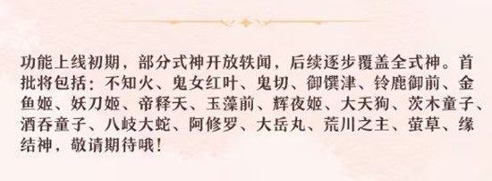 功能上线初期,部分式神将开放轶闻,后续会逐步覆盖全式神。首批将包括:不知火、鬼女红叶、鬼切、御馔津、铃鹿御前、金鱼姬、妖刀姬、帝释天、玉藻前、辉夜姬、大天狗、茨木童子、酒吞童子、八岐大蛇、阿修罗、大岳丸、荒川之主、萤草、缘结神等,敬请期待!