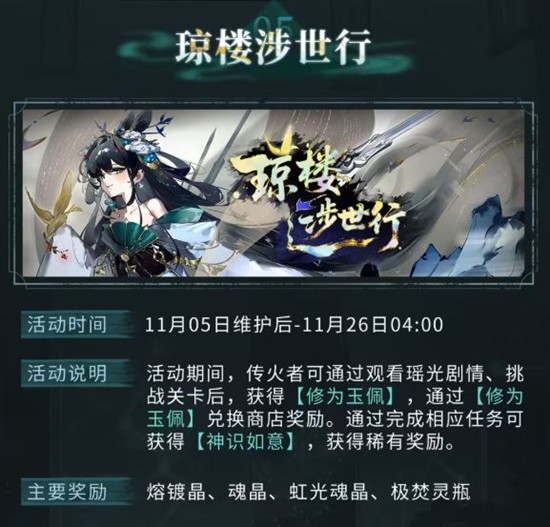 活动说明:通过观看瑶光剧情、挑战关卡后,获得「修为玉佩」,通过「修为」兑换商店奖励。