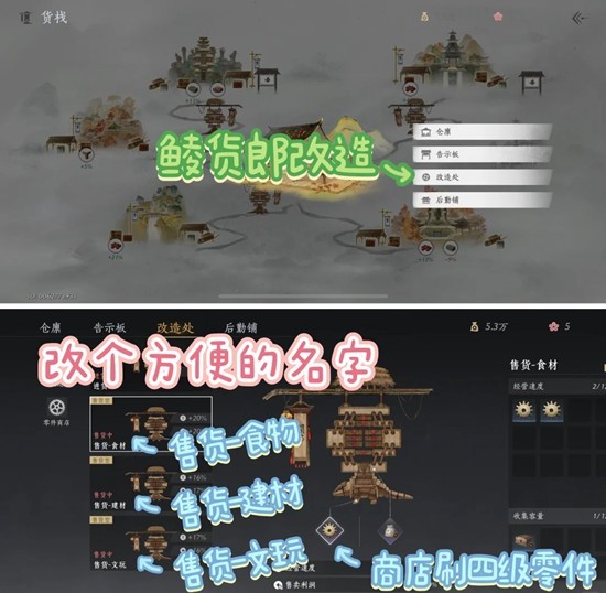 第三阶段某期 会解锁「鲮货郎」改造 我商店最高刷出五级零件+30%(阶段五的时候刷出来的 前期不要硬嗑四级20%)「鲮货郎」名字可以根据你放的零件改成进货-食物、进货-建材、进货-文玩、售卖-食物、售卖-建材、售卖-文玩 看你怎么方便