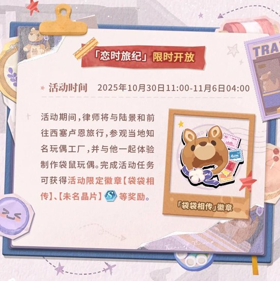 未定事件簿恋时旅纪·陆景和篇限时活动于2025年10月30日-11月6日开放~活动期间,律师将与陆景和前往西塞卢恩旅行,参观当地知名玩偶工厂,并与他一起体验制作袋鼠玩偶。完成活动任务可获得活动限定徽章【袋袋相传】、【未名晶片】等奖励,一起来和小编看看吧~