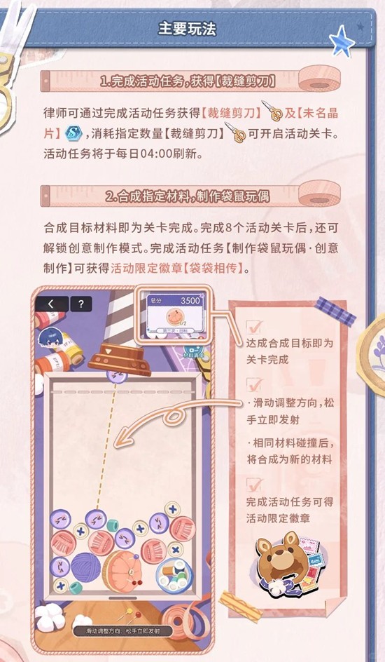 合成目标材料即为关卡完成。完成8个活动关卡后,还可解锁创意制作模式。完成活动任务【制作袋鼠玩偶·创意制作】可获得活动限定徽章【袋袋相传】。