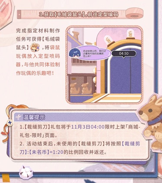 活动期间,律师将与陆景和前往西塞卢恩旅行,参观当地知名玩偶工厂,并与他一起体验制作袋鼠玩偶。完成活动任务可获得活动限定徽章【袋袋相传】、【未名晶片】等奖励