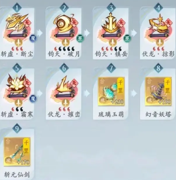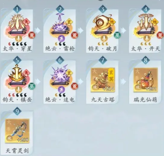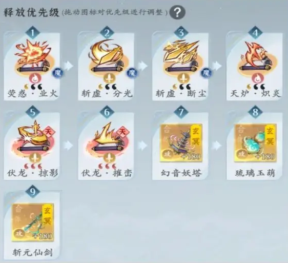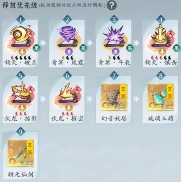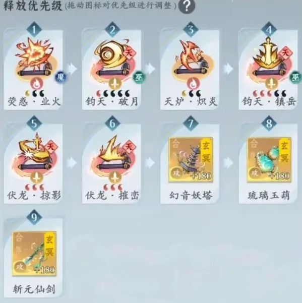 神通顺序:流萤、星移、六曜、炽炎、掠影、摧峦,切记顺序神通不是绝对固定的,要根绝自己神通品级灵活调整。