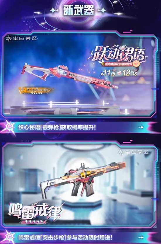 新时装包括“暗空魅影”、“清光蔼蔼”、“花间蝶踪”和“激昂旋律”等多款新时装,为角色增添更多风采,新武器新增“鸣雷戒律[突击步枪]”和“织心秘语[霰弹枪]”,参与活动限时赠送,为玩家提供更多的武器选择。