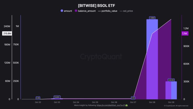 数据显示,BSOL首日资金流入量突破6950万美元,与Farside Investors披露数据吻合。Bitwise目前持有135.8万枚SOL以满足需求,其中109.8万枚于10月28日单日流入。按平均198.1美元的成本计算,该ETF投资组合当前估值约2.638亿美元。