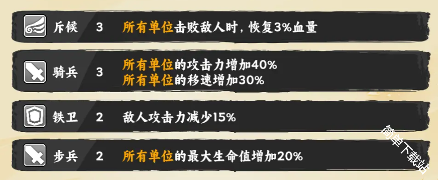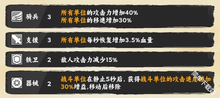 骑兵3-所有单位的攻击力增加40%;所有单位的移速增加30%