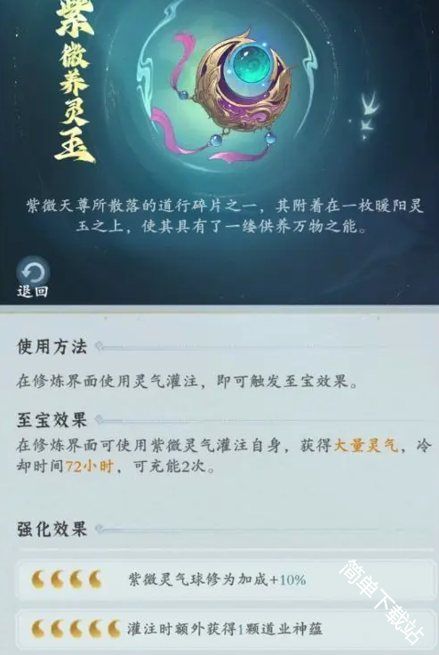 养灵玉可以持续提供额外修为,普通玩家养到5星就行,这样每次可以额外获得一个道业神蕴