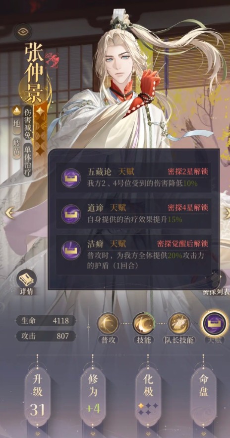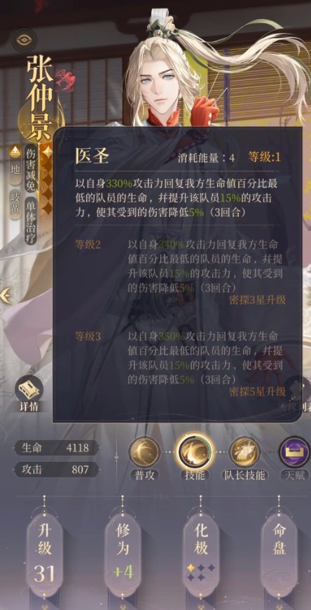 张仲景的普攻技能六经论能够为全体队友回复45%攻击力的生命值,治疗效果相当可观。医圣技能可以让队友受到的攻击降低5%,效果持续三个回合,同时还会为我方生命值最低的队友提供330%的治疗量。这些技能效果让张仲景在代号鸢中成为非常强力的辅助角色。