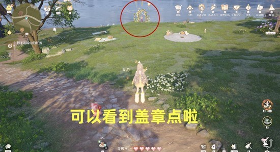 传送到 镇长宅邸前 锚点 ,往后面转,向水边走,就可以看到盖章处啦