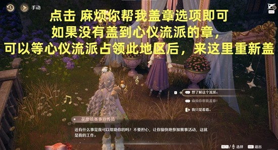 点击 麻烦你帮我盖章 即可,如果不满意当前流派徽章,可以等到自己心仪流派占领此地后,再去更改徽章样式;
