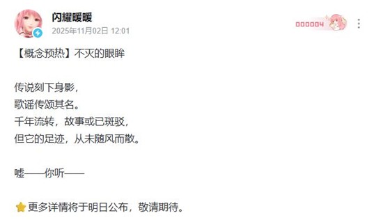 闪耀暖暖官方在今日发布了新概念外观“不灭的眼眸”的预热海报和预告视频。海报中,一双深邃而明亮的眼睛在黑暗中闪烁着光芒,仿佛隐藏着无尽的故事和秘密。预告视频中,光影交错,神秘的音乐搭配着片段式的画面,可谓是效果拉满了。