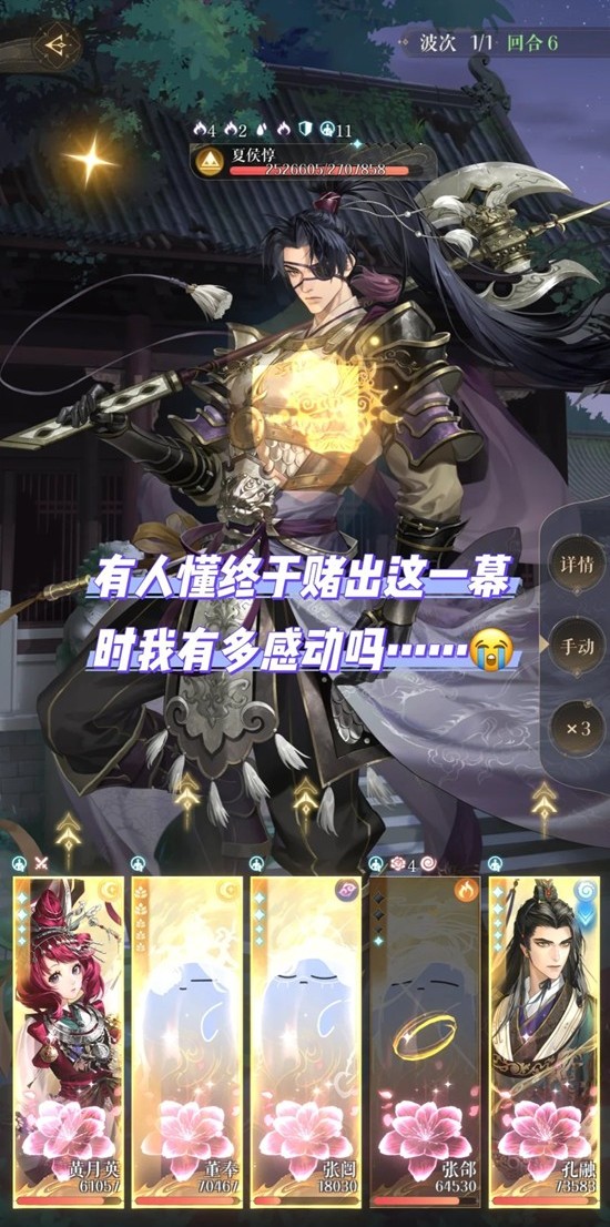 夏侯惇最多只能被攻击29次,第14回合开始一定要先看一下夏侯惇被攻击了多少次,如果已经29次但张闿还活着,重开;如果已经29次且张闿没了,之后的回合董奉A/↑,黄月英↓,张郃除了开大都↓,孔融↓,活着就是英雄;