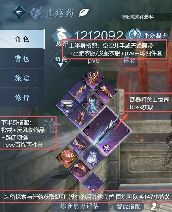 上半身搭配:空空儿手或无锋腰带+巫雅衣服/没藏衣服+pve百炼四件套