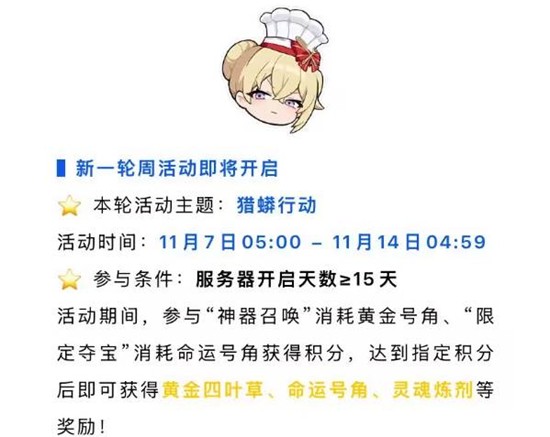 活动期间,参与“神器召唤”消耗黄金号角、“限定夺宝”消耗命运号角获得积分,达到指定积分后即可获得黄金四叶草、命运号角、灵魂炼剂等奖励!