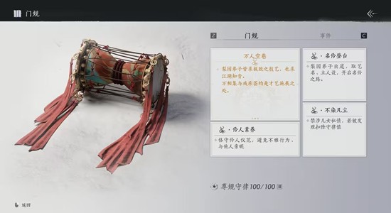 门规不仅要求梨园弟子当以艺名立世,塑人设、修言行,还对门人礼仪举止皆有约束,且名愈广,规愈严。自【立部伶】起,弟子皆需注意仪态,务必穿着成套衣物或上下装,乞讨一事更是禁止。从【典乐使】起,还需额外遵循:在公共场合避免与其他游侠进行亲昵行为,包括比心、壁咚、公主抱等动作。若在多人模式中违反,还有概率留下线人线索。