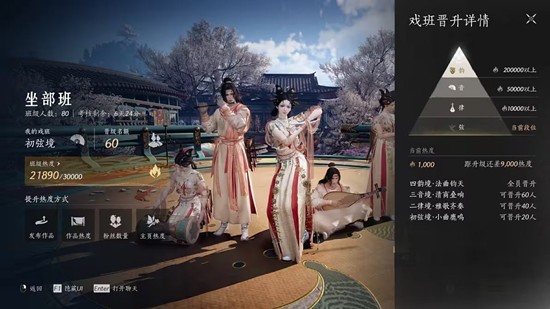 梨园门派中的地位排名,除了有常规的地位功绩排名外,门内还基于排行榜中所有弟子汇总出戏班总热度,以此进行戏班等级的晋升。