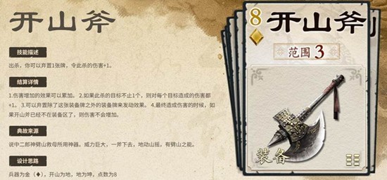 开山斧则是土属性装备中攻击力较强的代表。它的技能效果是出杀时,玩家可以弃置一张牌,使此杀的伤害增加一点。这个伤害加成效果可以叠加,如果玩家连续使用弃牌动作,就能打出巨大的伤害输出。当杀的目标超过一个时,每个目标的伤害都会增加,因此在群战中特别有效。