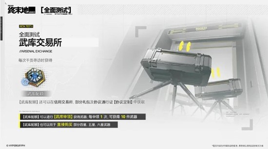 武库配额来源(抽武器的资源):千员寻访获得、信用交易所(没有具体展开)、部分礼包及协议通行证【协议定制】中获取