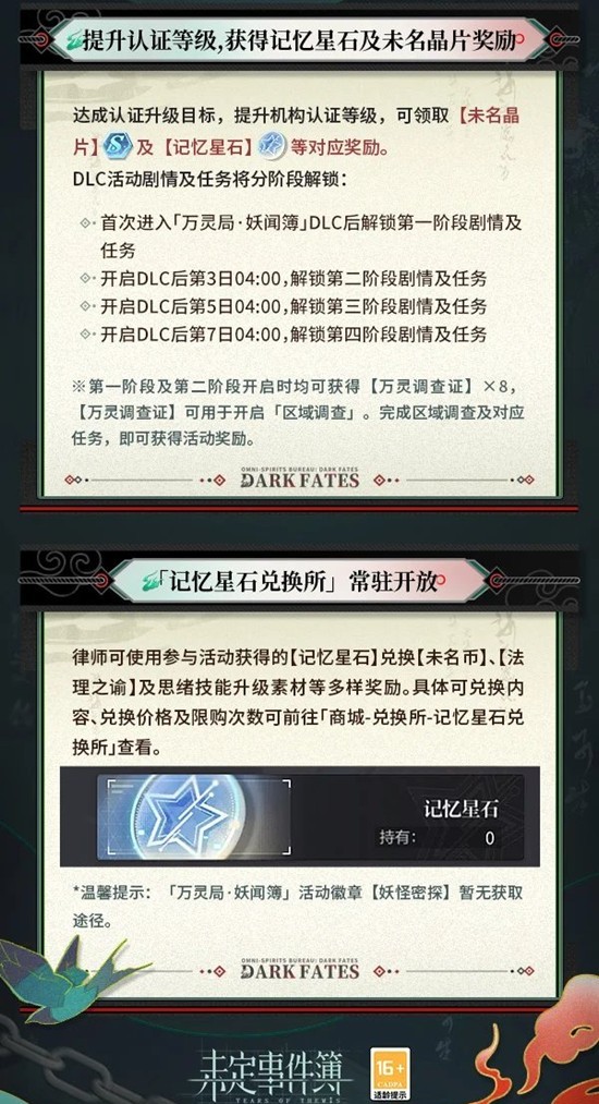 达成认证升级目标,提升机构认证等级,可领取【未名晶片】及【记忆星石】等对应奖励。DLC活动剧情及任务将分阶段解锁:
