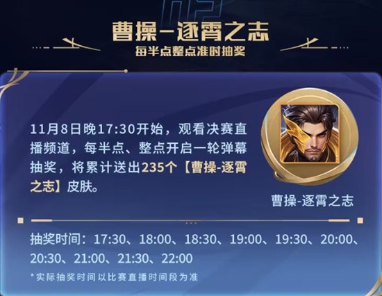 11月8日晚17:30开始,观看决赛直播频道,每半点、整点开启一轮弹幕抽奖,将累计送出235个【曹操-逐霄之志】皮肤。