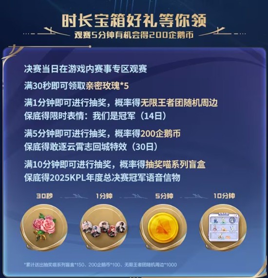 决赛当日在游戏内赛事专区观赛满30秒即可领取亲密玫瑰*5,满1分钟即进行抽奖,概率得无限王者团随机周边,保底得限时表情:我们是冠军(14日)。