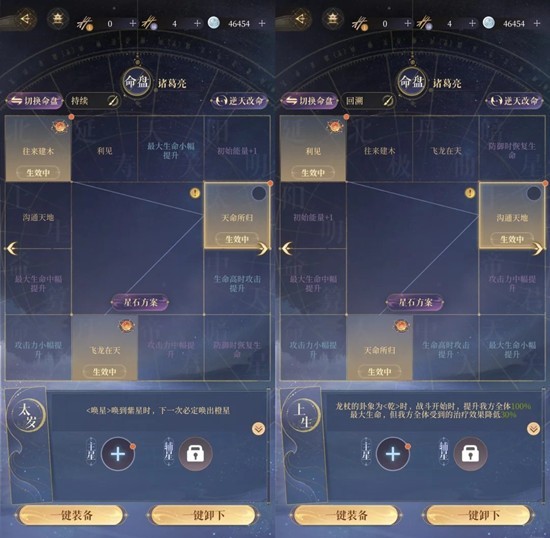打出高伤需要诸葛亮尽量保持在龙脉状态,他越快开大越好,所以二星天赋非常重要(队友放大概率回能),尽力抽二星,同时庞羲的命盘日光也能让诸葛亮回能,实战中基本可以保证一直有龙气一直在龙脉中