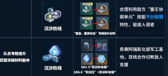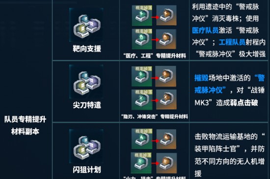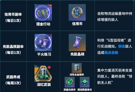 猎金行动是一个兼具效率的复合型副本,同时掉落充能晶核与信用币。当某日遗漏了上述两个日常副本时,可通过猎金行动进行补漏,节省时间的同时补足资源缺口。实训材料副本则分为两个阶段,分别产出实训补给箱与实训仪。实训仪是后期养成的关键道具,稀缺且需求量大,建议优先刷取以提前储备。靶向支援副本根据职业划分,提供影刃与冲锋突击职业的专精材料,练习特定职业时应针对性刷取对应资源。