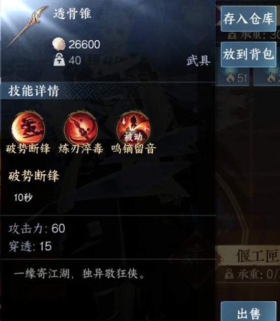 透骨锥主要是用于打架,装备差不多的情况下先手基本就能赢(炼刃-破势-绝技-一键)。