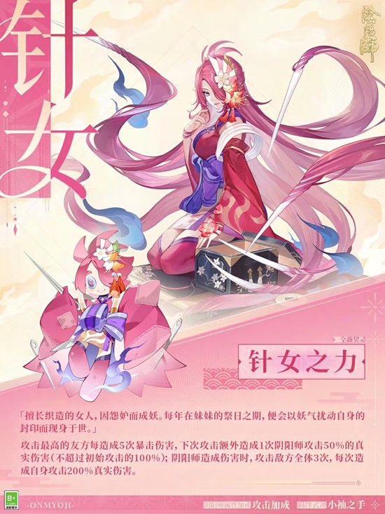针女是一位由怨念织造而成的女性角色,她每年在妹妹的祭日之期,会以妖气扰动自身的封印而现世。她的特殊能力包括: