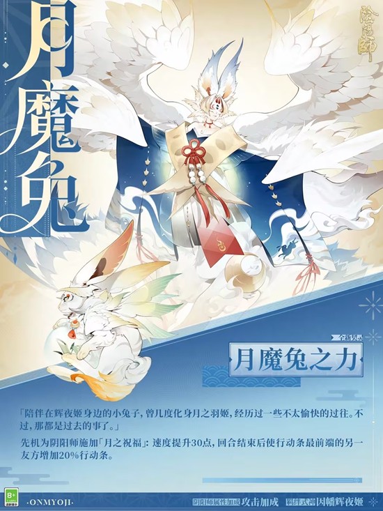 月魔兔是陪伴在辉夜姬身边的小兔子,曾几度化身月之羽姬,经历过一些不太愉快的过往。她的能力包括: