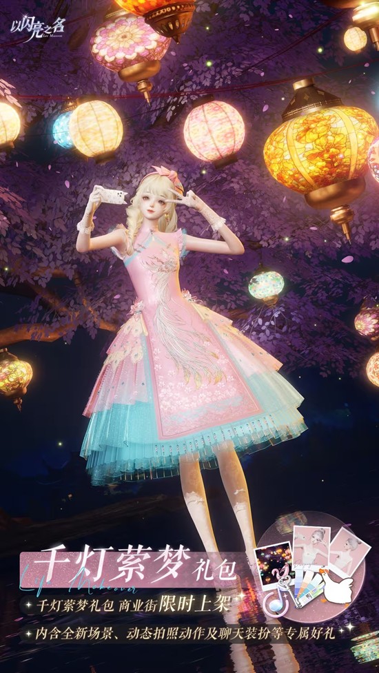 2.千灯萦梦复刻外观礼包:限时礼包售卖期间,合伙人可以4.6折的价格直接购买千灯萦梦外观礼包,内含摄像机镜头动态动作【千灯寻梦】、拍照场景【祈光秘境】、拍照动作【星空咒语】、拍照运镜【千灯寻梦】、背景音乐【千灯寻梦】、聊天气泡【鹅鹅天歌】、潮流色卡*26和遇之钥*40,该礼包永久限购1次。