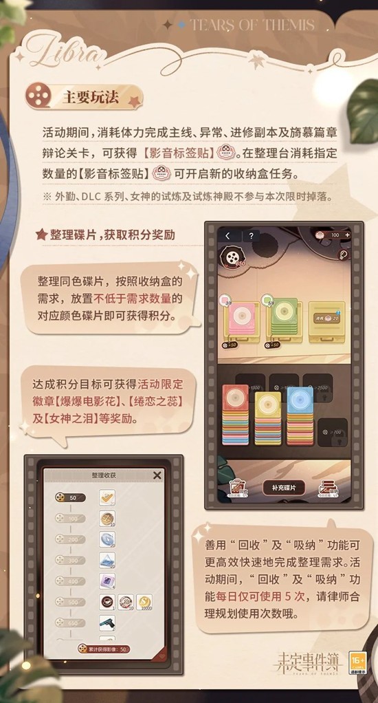 活动期间,消耗体力完成主线、异常、进修副本及旖慕篇章辩论关卡,可获得【影音标签贴】。在整理台消耗指定数量的【影音标签贴】可开启新的收纳盒任务。※ 外勤、DLC 系列、女神的试炼及试炼神殿不参与本次限时掉落。