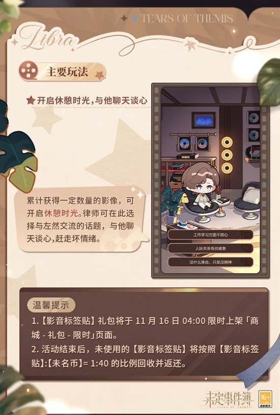 累计获得一定数量的影像,可开启休憩时光。律师可在此选择与左然交流的话题,与他聊天谈心,赶走坏情绪。