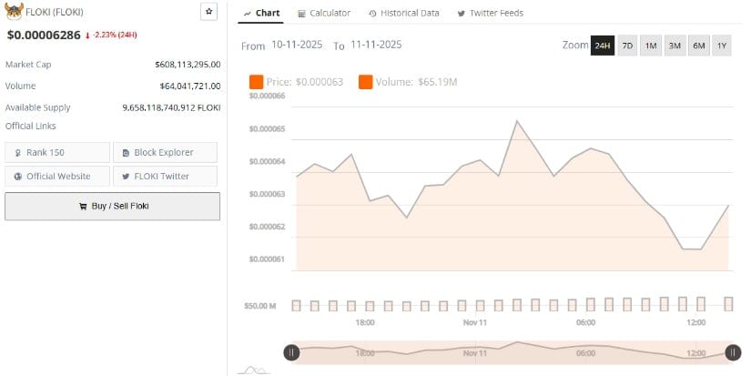 BraveNewCoin数据显示,FLOKI现报0.00006286美元,24小时跌幅2.23%。该代币市值达6.081亿美元,日交易量6404万美元,流通供应量9.65万亿枚。