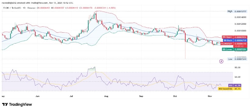 TradingView数据显示,FLOKI当前市场结构仍偏向空头,价格交投于0.00006185美元附近,低于中轨0.00006719美元。